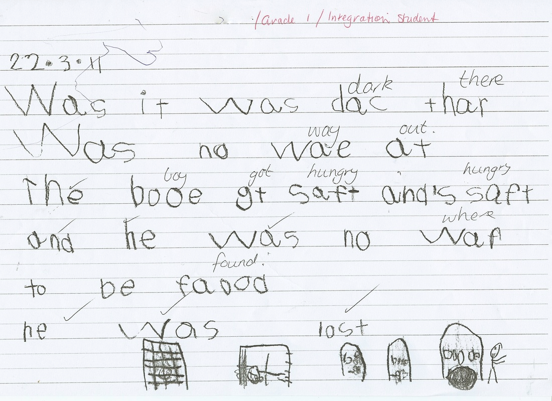 On this image, you can see a teacher has written the proper word above the student’s writing. When I was in school we were taught not to do that. Kids would turn in a writing like this, and teachers would tell them it was awesome, and that would be that. I was so confused—how are they supposed to learn spelling? If you don’t correct them, how will they improve? The answer always was: we’re teaching fluency. The details will sort themselves out later.